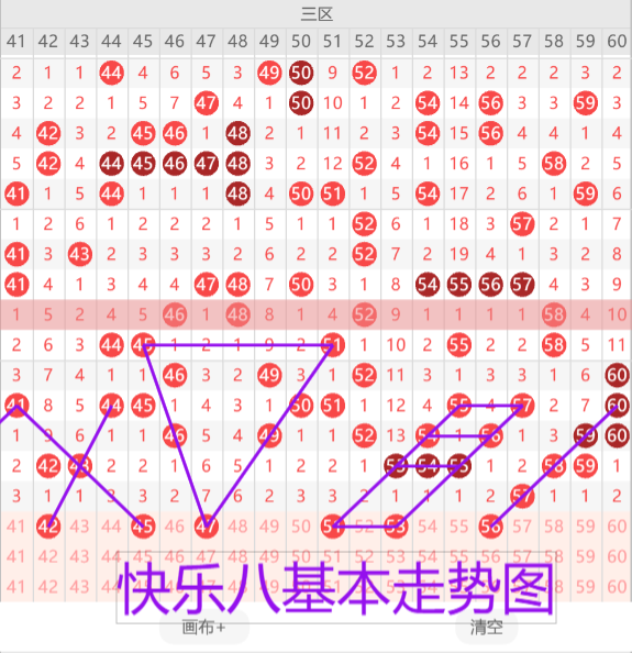 我们来看下三区的基本走势情况,上期开出了一枚开奖号码,本期预计开出3-4枚开奖号码,首先我们来看同路交叉走势的42 43建议二选一考虑。遗漏七期的47双线三斜连。51 55均为三斜连指向号码接替形态,建议二选一。56的六斜连重点防守。