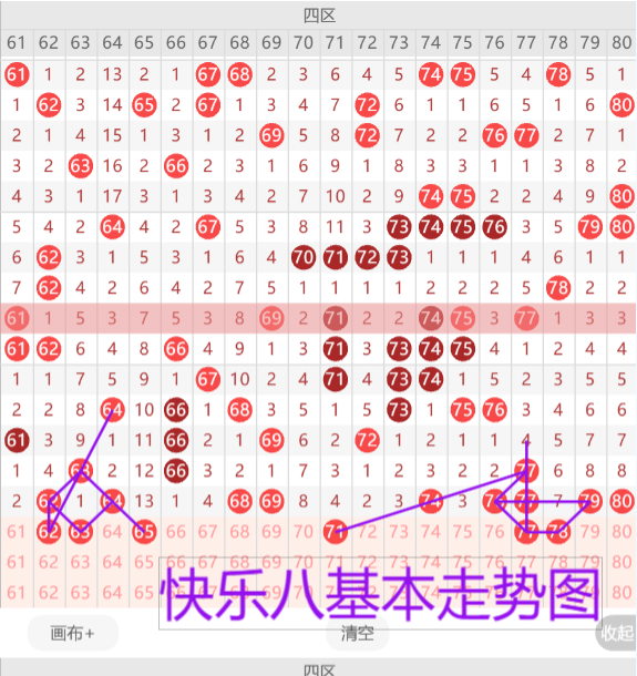 我们来看下四区的基本走势情况,上期开出了九枚开奖号码,本期预计开出4-5枚开奖号码,首先我们来看空心梅花的63重点形态可以考虑左右62 64带二连。重点防守遗漏13期的65开出。71的同路三斜连。77 78的堵漏形态。