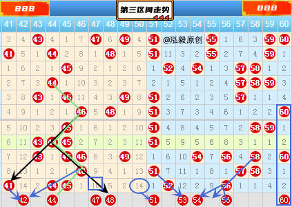 上期我在该区间选了四连号42 43 44 45,以为会出一个三连号,结果只出了44 45,不过挑号还是挑了45号,效果还是不错的,既然上期开出了连号44 45,那么本期我们就要注意它的落号情况了。在51-60号数字区间,51 52 53和55 56 57形成了对称3斜连,这个我们也是要注意一下的。