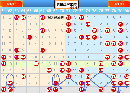 这几期在61-70号数字区间都是走冷状态,这几期里我都是放弃状态,想着等它出号超过3个以后再来考虑的。本期我的重点也是不想放在该区域,本期该区域我们主要看上期开出的两个冷号的重号和邻号就可以了。在71-80号数字区间上期开出了5个号码,该区间在近期内都是比较热的,我们要防守它突然转冷,本期在不断号或者只出一个号的情况下,肯定是要有重号出现的,在该区域我们可以重点考虑一下重号的出号情况。