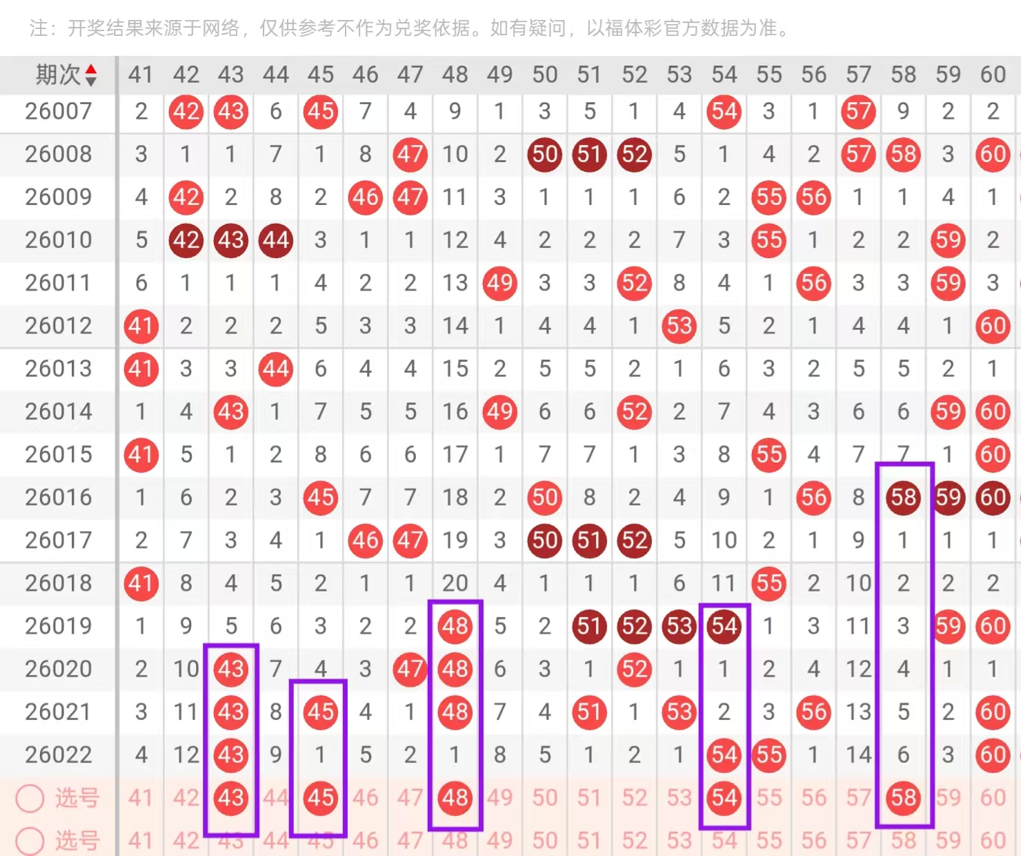 三区41-60:三区间,上一期回补了4个号码的下落,从近期三区间号码下落点位来看,呈现出了由冷由热转冷的形态,今天我们要重点关注的是三区间空缺位置的下落和重码的一个回补,在4头,首先我们要重点关注的是42-44的落号,点位和48-49的落号点位,今天这里可用42-45的搭配和43-48的搭配回补,回到五头位置,今天这里我们要重点关注的是羊角形态重码的一个下落点位,和梅花形态的一个回补,这里可用52-55的搭配回补和54-58的搭配回补,在头部位置,值得我们重点关注的是51-52开出对子下落的可能。