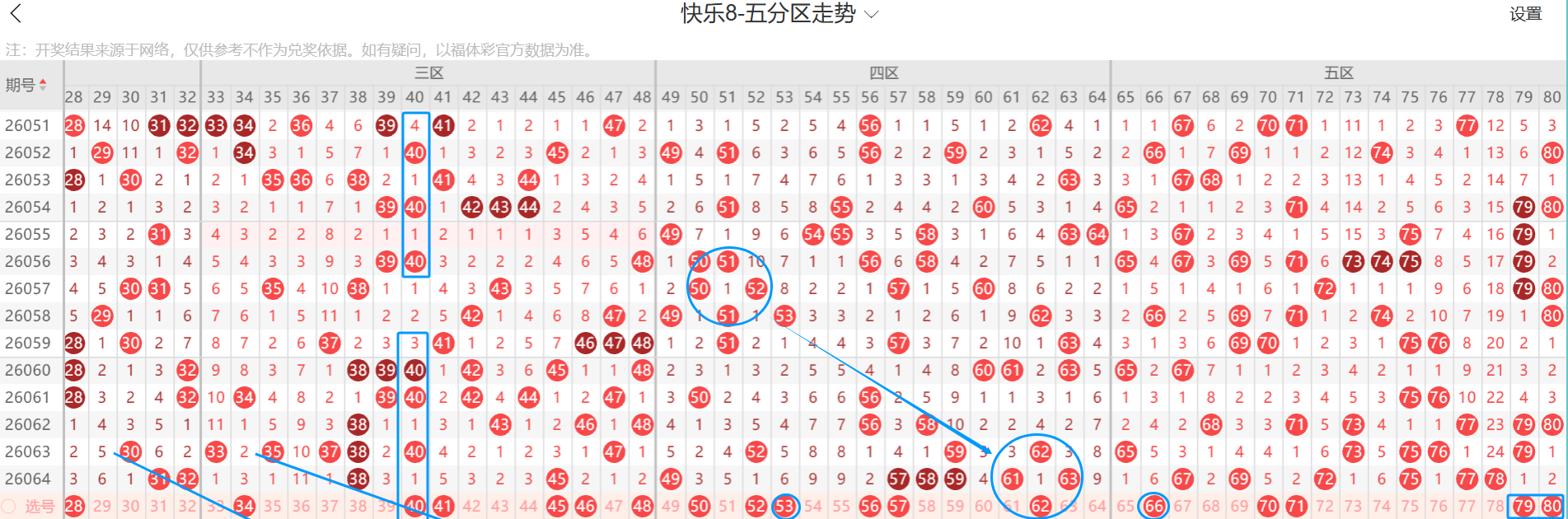 三区上期最看好41.45可惜没给这个41,本期想看这个34,我发现今天喜欢的4尾比较多,还是以热区为主吧,即4.14为主,其次关注这个40,遗漏跟上面很像,上面是411,下面是311,如果开出这个40会非常对称,仍然看好41,此外看45出重号,看46.48出一,结论是三区重点关注34.40.41.45.48,三胆41.45.48,双胆45.48,我感觉41.45可以做个选二追号,应该快要出了。本期第二个看好的热区是四区,上期笃定有3尾,即53.63出一,开出63,本期看好2尾,即52.62,那么会不会是62呢,跟上面的走势一样,都是画了个圆圈,哈哈,也行我选错,二选一的,如果大家有特别看好的,请相信自己,看好50,继续看好3尾的53,重号倾向57,重点关注50.52.53.56.57.62,三胆50.53.62,双胆53.62,可考虑选二53.62或选二复三52.53.62.