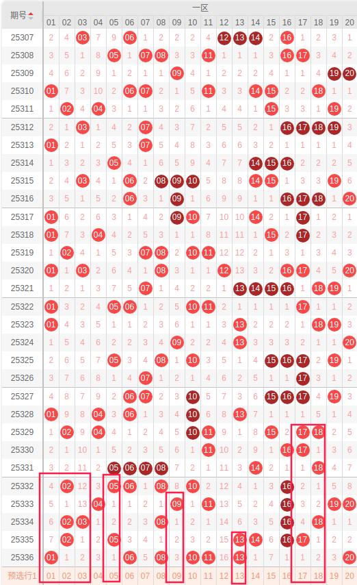 一区:最近一区10期出号情况为:7 5 7 3 6 6 6 5 6 7,总出号情况为58个,平均出号5.8个,本期推荐一区号码回补推荐出号为:01 02 03 05 09 13 17 18。重点关注:01 03 09 13 17 18。