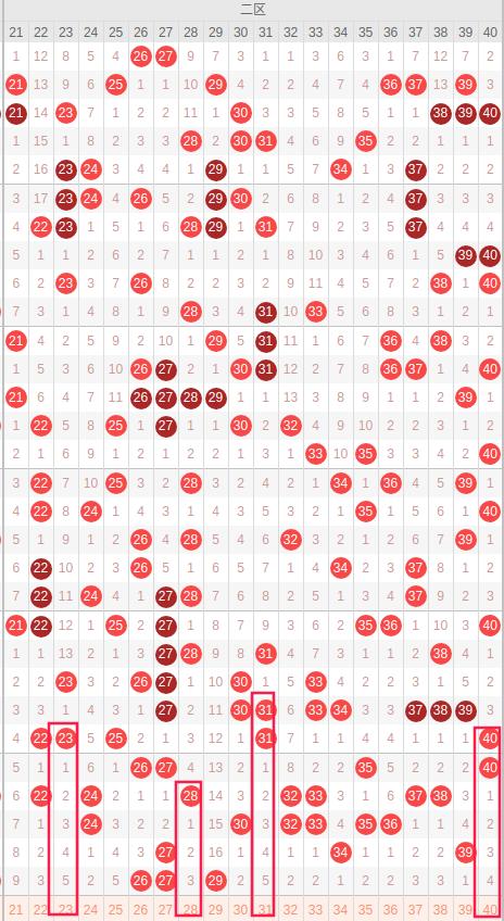 二区:最近二区10期出号情况为:7 4 5 8 5 4 7 6 3 3,总出号情况为52个,平均出号5.2个,本期二区号码还是比较弱势推荐:23 28 31 40。重点关注:28 31。