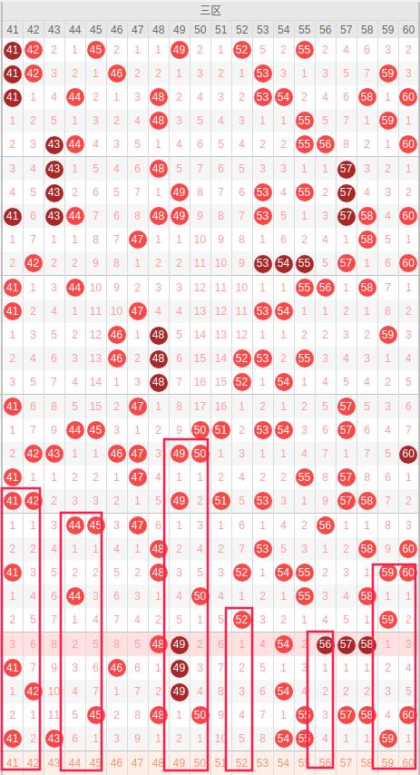 三区:最近三区10期出号情况为:4 4 7 4 2 6 3 3 7 5,总出号情况为45个,平均出号4.5个,本期三区号码走势比较不错推荐:41 42 44 45 49 52 56 59 60,重点关注:44 45 49 50 52 56 59 60。