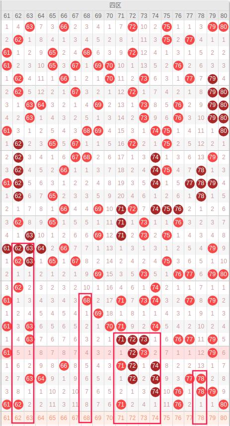 四区:最近四区10期出号情况为:2 7 1 5 7 4 4 6 4 5,总出号情况为45个,平均出号4.5个,本期四区号码推荐:62 63 68 71 72 73 74 78。重点关注:62 68 73 78。