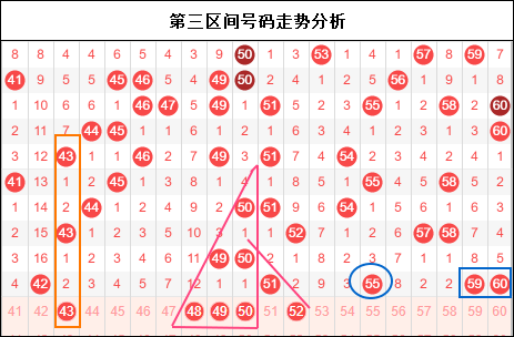 第二区间思路:二区昨晚出现断区,如果回补的话这一期注定是相当精彩的一期,毕竟断区前这里走出了七个号码。所以面对今晚二区上的若干三角杀走势,我相信大家都知道这里该怎么布局了。好的号码大家都能看到,能中奖的号码自然需要一番心思。所以明码暗码搭配形成连号的思路应该是相当占据优势的。