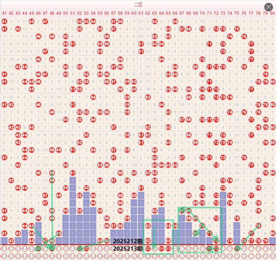 如图所示:在本期大数区的选号中注意在上期的走势中三区间开出了6枚中奖号码,在近期的走势中三区间的落号数量相对保持的还是比较稳定的,上下浮动值不大,在上期开出6枚中奖号码之后,本期注意落号数量的小幅度下调走势,重点在上期开出42 45 47 48的位置下方考虑做号,5字头在经过断号之后,上期开出了二连的回补,本期注意在上期开出55 56的位置左右方直接考虑连号的延续走势52 53或者是58 59,个人较为看好断点的形态走势,四区间在上期的开奖结果中开出了8枚中奖号码,仅7字头的落号数量就高达6枚,形成了2/4区同位的交换走势,本期注意在上期3字头爆号之后,并未出现重号走势,3字头仅开出了一枚中奖号码,本期要注意在上期爆号的小区段内有着断号的风险,但是还是要注意75号的延续第四期走势,以及71号的折返走势,考虑71 72的二连走势,或者是在71 72 75的三码中考虑双码的走势,6字头上开出62 65的同路双码走势,本期建议优先考虑62 65的同路双重走势,或者是考虑近期形态上较热的走势,出现左右延续走势,注意59 68的单点走势,如果考虑62 65的位置出现重号走势,可考虑二连的落号形态。