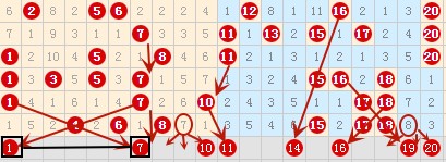 上图中1 7号数字以4为中心形成了完美对称,他们又是同路数字,所以本期1 7号数字应该是要有号码开出来的,这里可以选一胆码了。10号数字是属于小冷号的邻号,可以关注一下。11号数字与10号数字为拐角对称,这种类型的号码也是经常开出来的,这里可以参考一下,作为防守号码。15号数字上期属于直三连空一跳类型,所以本期应该不会开出来了,我们就从它的邻号下手作防吧。16号数字与前面的17 18号形成了三斜连,可以参考一次。19号数字与前面的16 17 18号数字形成了四斜连,上期开出的三斜连有点多,本期应该是要出现4斜连的,这里可以关注一下。15 17 18号这种连号空一带号的类型,上期开出了两组,本期有一组里面是要落号的,也可以关注一下。
