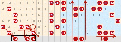 上图中23号数字与前面21 22号数字形成了三斜连且它又是重号空二跳对称类型,这里要重点关注。上期说过24 25号这个连号旁边带冷号是要落号的,上期开出了26号数字这个冷号,本期它的邻号和重号也是我们的关注重点,24 25号这个邻号上期没落,那么本期落号的概率就增加了,那么本期的24 25 26号数字中就有号码要开出来了,所以我们可以从23 24 25 26号数字定一胆码了。33 34号数字都是属于对称类型的号码,这里我们也要防守一下。上期中开出来了37 38 39号数字这个三连号,本期难以判断是否要落号,所以我们选一号码做防守即可,不用过多关注。