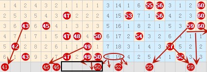 上图中41号数字与前面的42 43号数字形成斜三连,它又是43号数字的好兄弟,它俩经常是一前一后的露面,所以这里可以重点关注一下。上图中43号到47号数字之间有两个小冷号,这种属于空三出号的类型它们中间也是经常开号出来,所以这里的45 46号数字也是我们重点关注对象。47 49 50号这种类型的组合前面已经说过,既然前面我们没选号作参考,那么我们在这里就可以在47 49 50号数字中定一胆码了。上图中的59 60 61号数字这个三连号已经同时遗漏三期了,所以本期应该是要有号码开出来的,这里也要重点关注一下了。如果本期不落号下来,我们就可以直接放弃该连号落号了,等他落号我们在来分析。