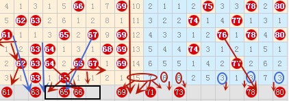 上期开出来2组三重号,这是不是在为本期出4重号做铺垫呢?这里我们也要防守一下,所以这里的63号数字我们也要关注的。在上期中64 66 67 69这种连号空一跳带号的类型,上期既然没落号,那么本期就是我们关注的重点了,本期至少有一码要落下来的,所以我们可以从64 66 67 69号数字中选一胆码出来了。上期71-80号数字区间断号了,本期该区间有2组相同遗漏期数的数字,所以本期必定是要出号的,我们可以从2组遗漏值相同的号码中选号作为参考。好了,本期分析就到这里了。