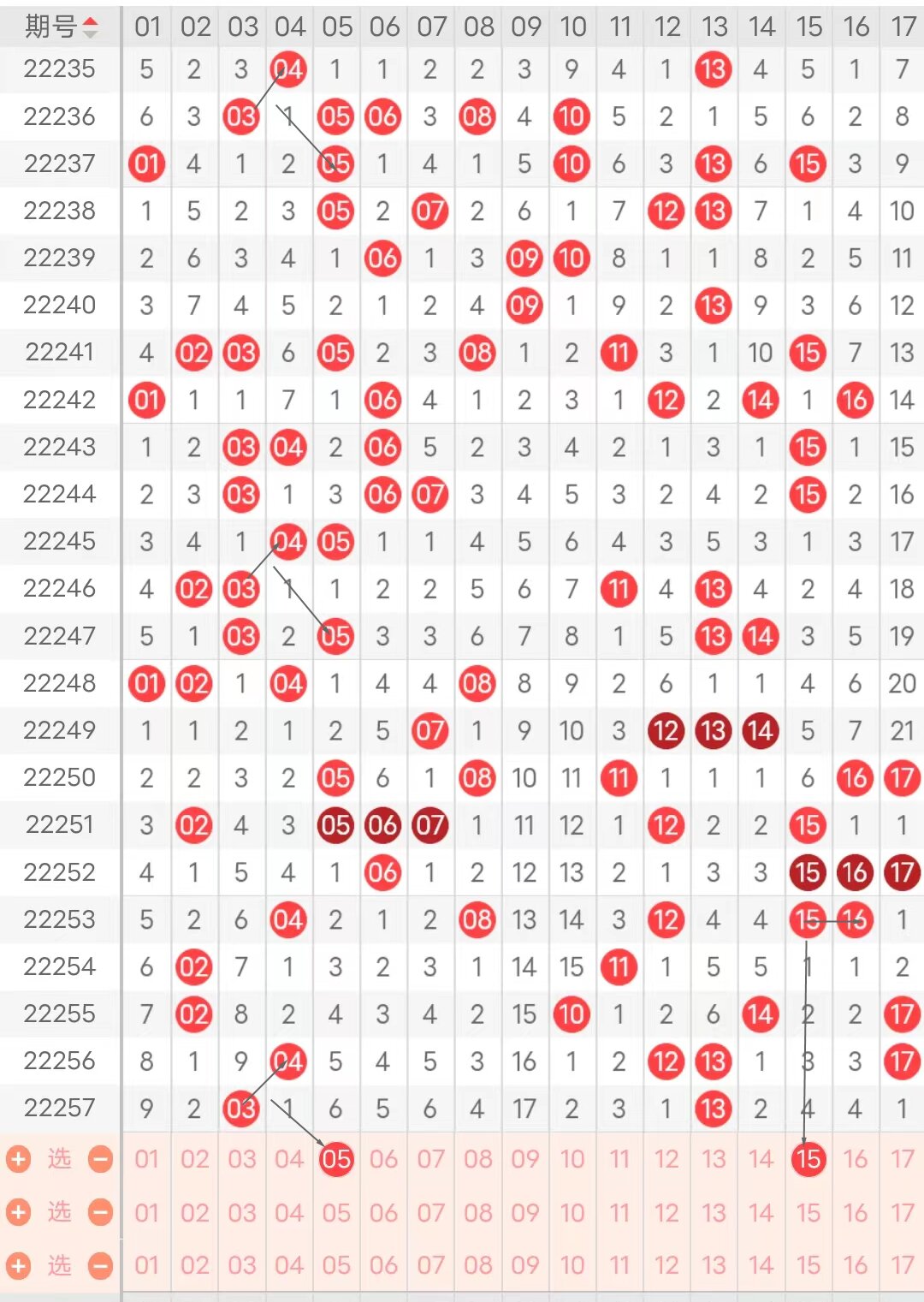 纵观前20期中,3、4号一出,5号立马就跟着出来,所以个人感觉出5的几率很大。再看2022253期的15、16两连号已经有4期没落过一个号了,估计今天会落一个,我就定15号吧。我们再来看第二区间,如下图: