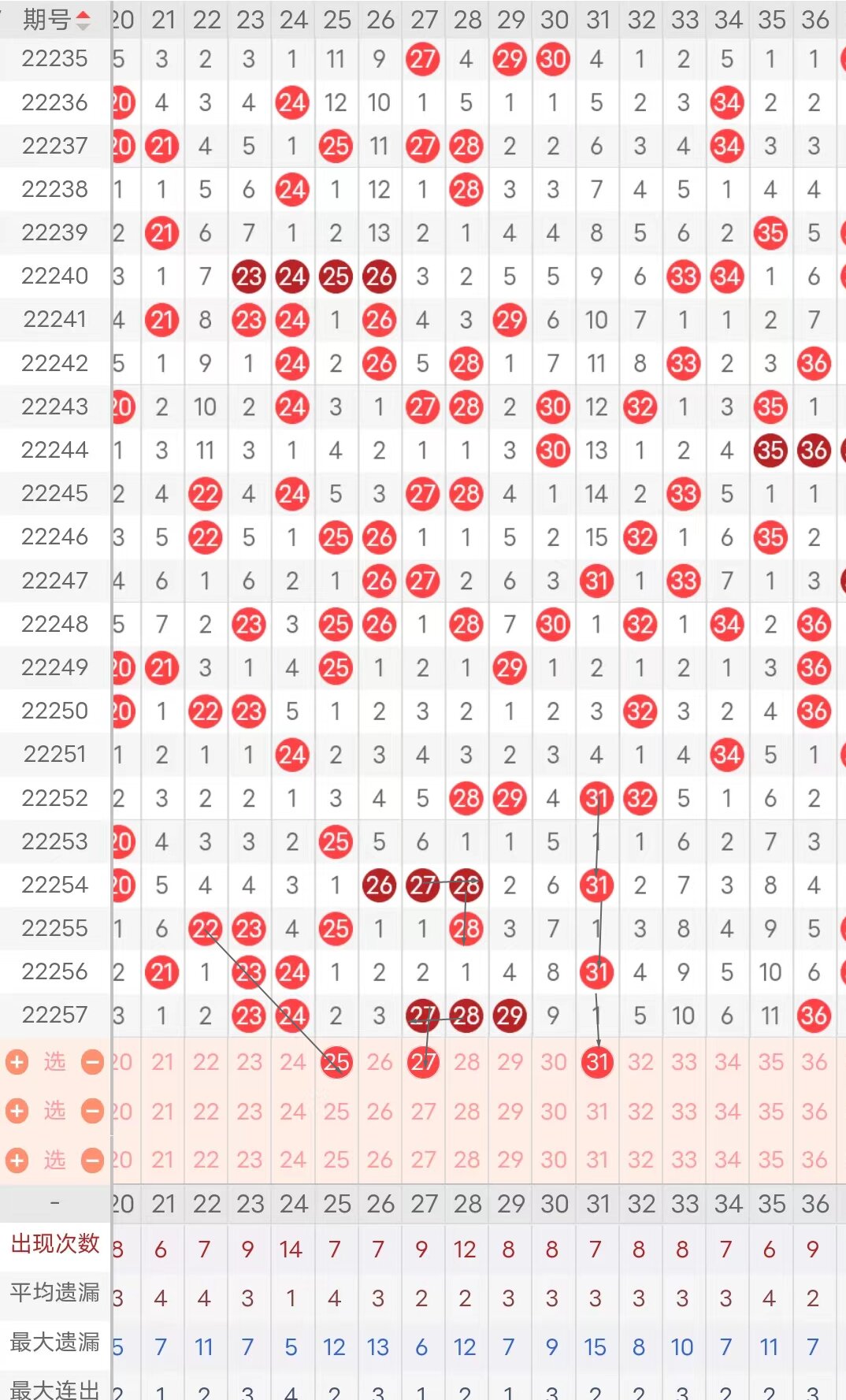 在前面20期内,出现4斜连的情况比较多,我们必须预防出斜连,在上图中前三期也出22、23、24,所以这期我们就定25号。纵观历史出号规律,上期有3连号出现,下期3连号有80%是要落号的这里我选了27号,防29号落号。我们接着看前20期,空一落号的情况也是比较多的,大多都是空一落个3、4次左右,所以我比较看好31号。第二期间暂时就看好这些。