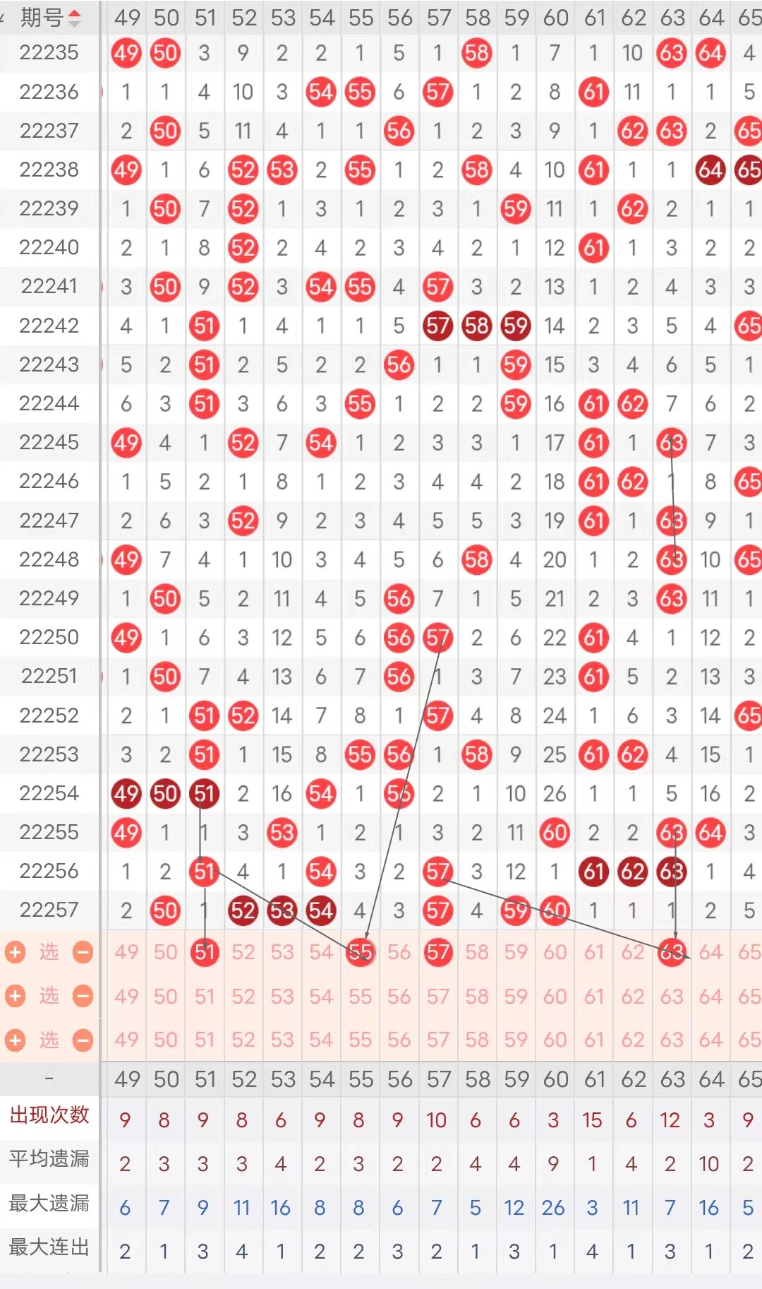 上期出了2个3连号,前面一个3连号我预测落号,上图的3连号我们就不选落号了,选他的邻号,我们来看51号,51号前3期都是空一落号,所以根据以上2个原因,51号出号率比较大的。55号我们就做防号即可。在近期中落三重号的情况也是比较多。第三区间属于热号去,所以这期的三重罗浩要看好57,54号前面为啥不选,上面我已经说过原因了。再来看20222256期的61、62、63这3个连号在2022257期没有落号,那么这期最少要落1个号,个人比较看好63号。