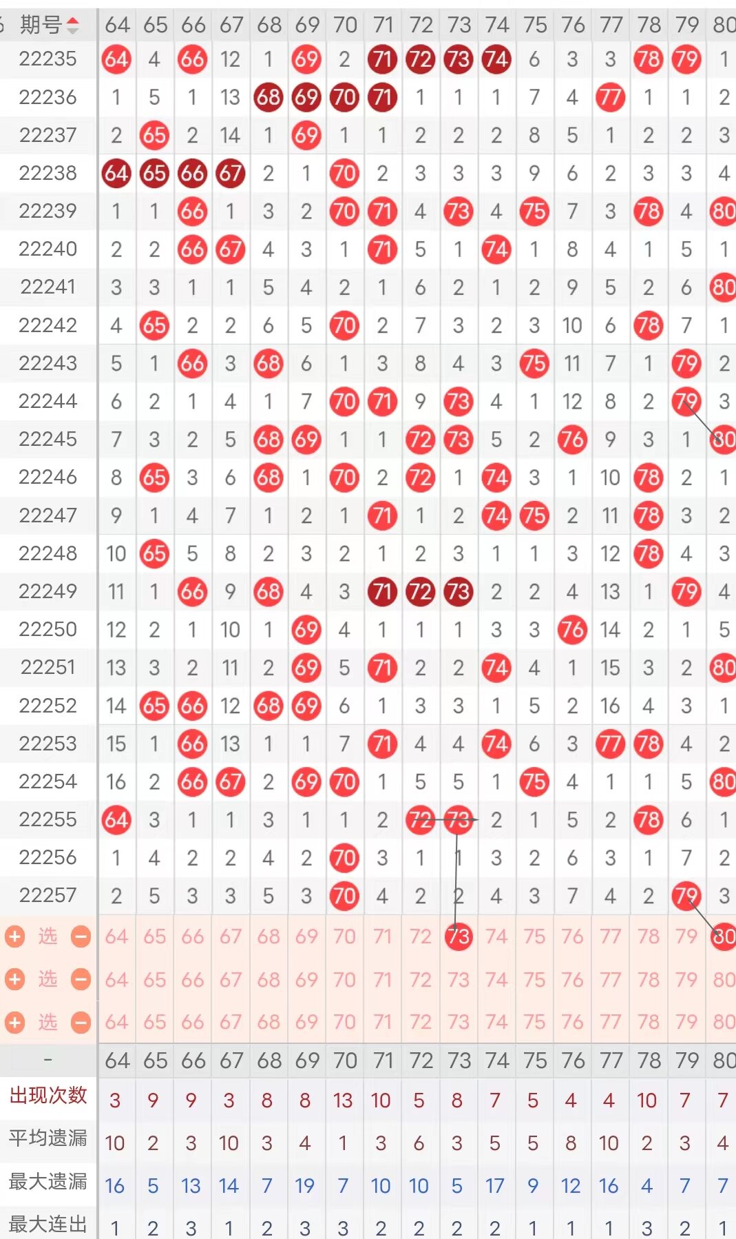 在2022255期的72、73这个2连号已经2期没有落号了,所以我预测这期大概会落一个,个人观点比较看好73号。80号我们可以做防号。80这个号码一直都是不冷不热的,已经有3期没出了,所以可以防一下。以上就是个人本期的选号思路。