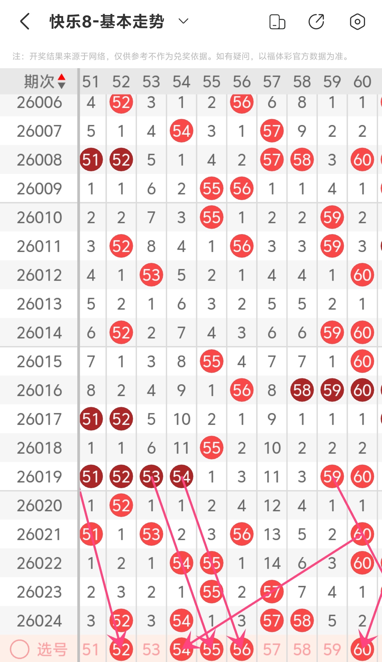 上期第六区间开出52 54 57 58,52为重码带斜连走势,54为重码带斜连走势,55为斜连走势,56为斜连走势,60为斜连走势,本期推荐54 55 56 60