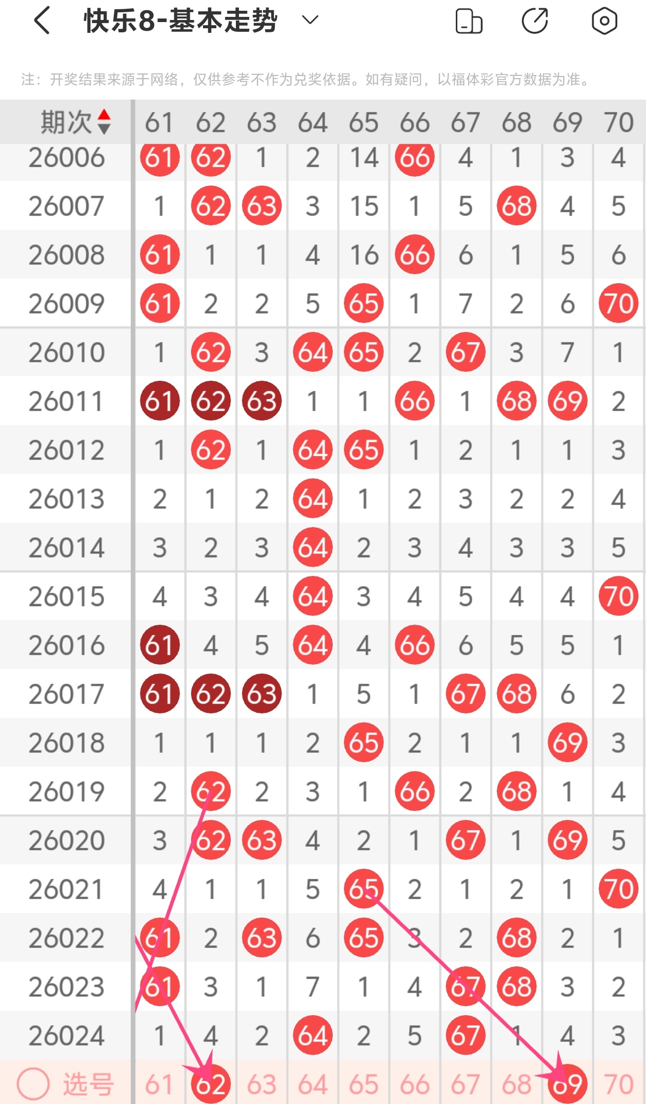 上期第七区间开出64 67,62为斜连走势,69为斜连走势,本期推荐62 69