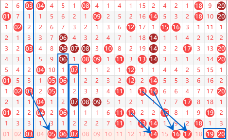本期的03号数字我们可以注意一下,是属于空三对称的号码,出号机会还是有的。本期的06号数字是属于121走势,本期的121走势有有3个,本期我们要注意出一个号码的情况。三连号07 08 09号数字我们要注意出号情况,本期落下一个号码是没有问题的,我们重点关注一下07 09号数字的出号情况就可以了。连号空一带号11 13 14号数字我们要注意了,这里应该会出一个重号,我们重点考虑一下13 14出重的情况。16 17号数字我们也是要关注一下,出一个号码的情况。