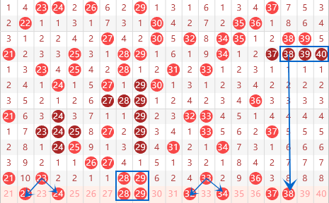 本期的22号数字我们可以关注一下,上期开出21 23有可能把本期的22号数字夹出来的。连号25 26和连号26 27形成了阶梯是类型,本期我们要注意一下24 25落号情况。连号28 29号数字我们要注意走重的情况。上期开出了33号数字,本期我们要注意它分边的情况,尤其是34号数字的出号情况,我们要注意一下。连号38 39 40本期是应该要落号了,本期我们重点关注一下38号数字的出号情况就可以了。