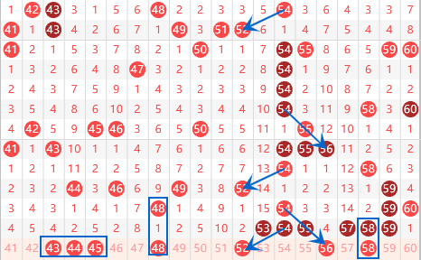 本期的44号数字我们要注意一下,上期开出来了33号数字,本期有可能会把44号数字带出来了,而且我们要注意一下44 45同出的情况。上期开出了三连号53 54 55和57 58 59 60,本期我们要注意一下夹号56号数字的出号情况。也是要防守一下58号数字走重的情况。