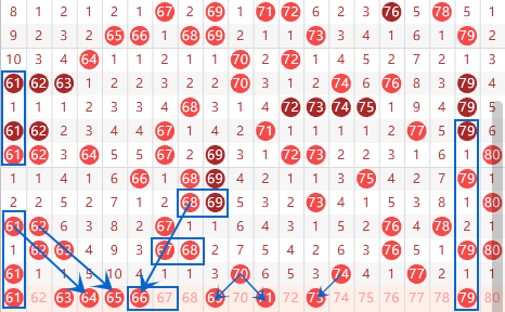 本期的63号数字我们可以注意一下,出号情况还是有的。本期的66 67我们要注意出一个号码情况,尤其是66号数字出号机会很大,我们可以重点关注一下。上期开出了70号数字,本期我们要注意一下它出现分边的情况。上期开出了74号数字,本期我们就要注意把73号数字带出来的情况了。本期的79号数字也是属于121走势,我们也是可以关注一下的。