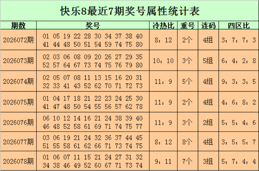 福彩快乐8第2026078期开奖回顾:01 06 07 11 15 21 24 27 31 32 34 38 46 49 52 60 67 71 73 74,其中奖号冷热比为9:11,开出7个重号:06、21、24、32、71、73、74,四区比为5:7:4:4。