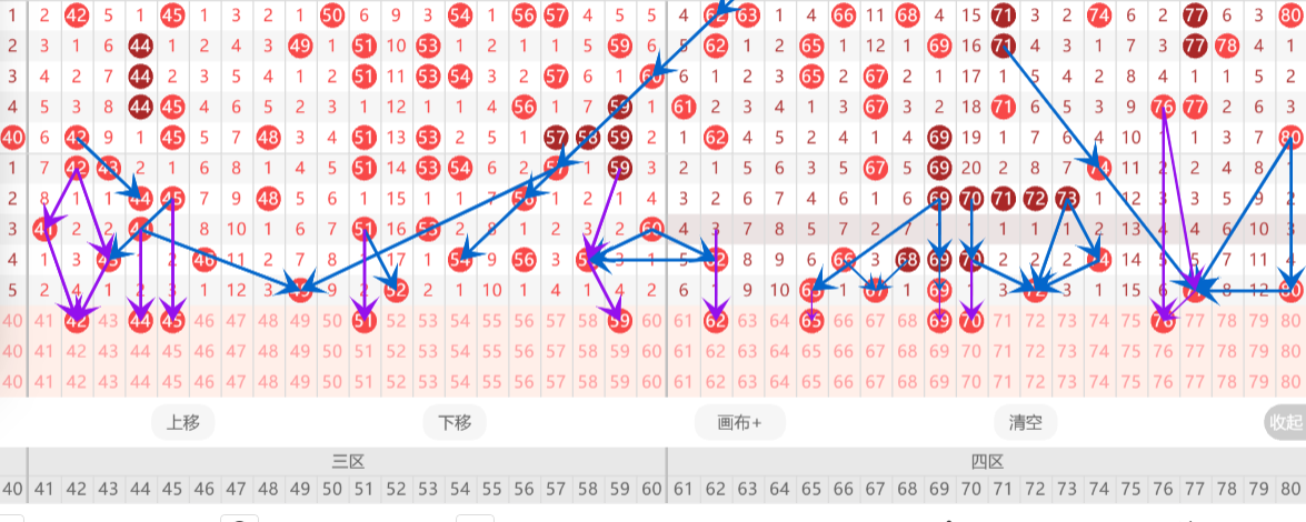 上期第四区间开出号码:65/67/69/72/77/80共六码,整体为热态,本期区间热度将进一步上升。