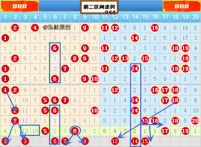 上期在01-10号数字区间开出了05 08号数字,那么本期的04 06 07 09我们就要注意了,当05 08单出的时候下期会带号出来的,我们要重点考虑。其次就是11 12 13号这里我们做号要小心一点,毕竟三角形10 12 14它们的角底号已经连续断号两期了。本期的16 17 18 19 20这里我们要注意了,有断号的可能,做号要小心一点。