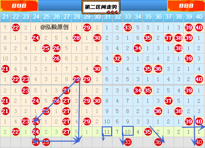 该区间的斜连号24 25 26 27 28我们要注意一下,本期应该会落号下来的,重点关注一下25 26 28的落号情况。其次就是在27 35之间的两个冷号,我们要重点考虑,落一个的机会也是比较大的。三角形36 37 38上期没能出回补号,本期我们要注意防守出现回补号。