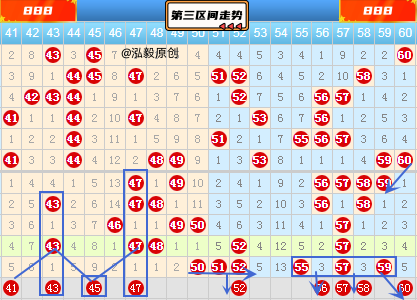 该区间的43 47号是属于空一对称类型,我们要注意防守一下。三连号50 51 52本期我们也是要抓一下它的重号的,50是属于冷号回补,根据近期走势不是很容易出重号,所以我们主看51 52抓一码就行。其次就是55 57 59这个空一三连号出号组合了,这里会出一重号和一夹号,我们要重点考虑。