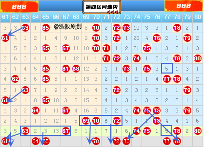 该区间的63 67是属于空三类型,本期还有另一组59 63都是连在一起的,所以本期的空三中心号61 65我们做号要小心一点,建议不要过多的去做号。69 70 72这组连号空一带号上期没能落号下来,本期我们要做一下它出现回补的情况,根据以往的经验来说回补一个号码是有很大机会的。