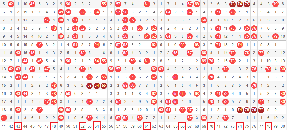 接下来我们一起看走势图,我们把01-40分为前区,41-80分为后区。