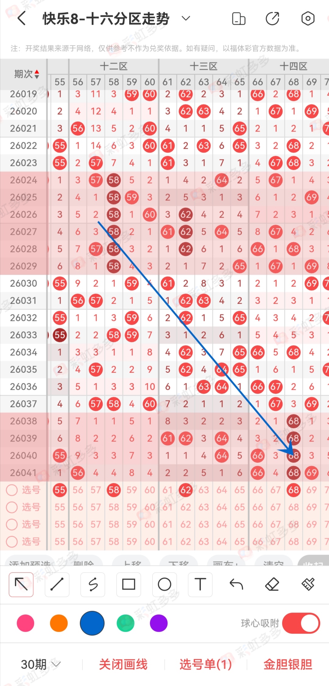 第二个点位说一下55 58 62 68。这里的4个号码在近一个月应该是稳定出号。不能说多开,但是稳定出一个还是有机会的,另外在特殊的时候多数开出来2码。我们每年都会总结一些特殊的点位,比方说高频的数据推荐,我在想这里的4码就可以大方向定位。只是这里不存在规律顺位。也没有存在能够看出来的高频的逻辑。反正一句话就是定位,5头6头没有什么基本看法的时候,就可以在这里的4码当中选择一个。