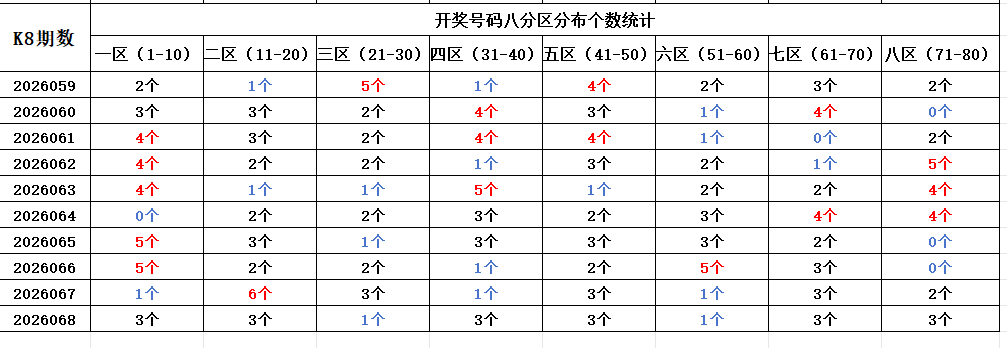 首先看上期回顾,“快乐8”第26068期开奖结果:1.4.10.18.19.20.22.31.35.36.44.49.50.52.61.67.68.74.75.78通过分析开奖号码,分享第一个数据分析:统计开奖号码的八分区冷热走势,判断出号规律。以近10期开奖号码的八分区统计数据为例:
