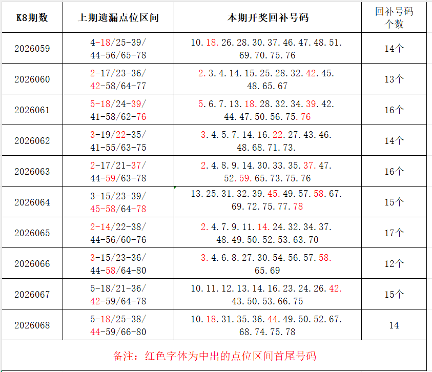 如图,上期的遗漏号码在下期开出10个左右,即为回补号码。定准点位区间首尾号码是关键!以上期2026068期为例,定位4个遗漏区间,围中14码!结合上期开奖号码,以跨度值大于或等于7为依据,本期关注3个遗漏区间:10-18/22-31/52-61;重点关注遗漏区间:2-16/21-35/43-58/62-79。点位区间号码和大底号码请勿混淆,个人分析,仅供参考。
