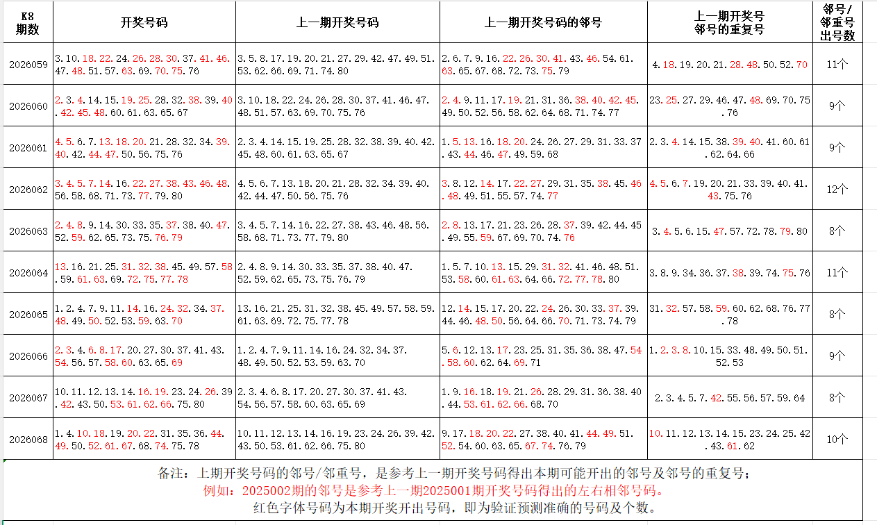 如图,红色字体是上期邻号、邻重号在下期开出,每期开出10个左右。上期邻号开出8个,邻重号开出2个本期参考邻号:2.3.5.9.11.17.23.30.32.34.37.43.45.48.53.60.62.66.69.73.76.77.79;邻重号:18.19.20.21.35.36.49.50.51.67.68.74.75;个人分析,仅供参考。