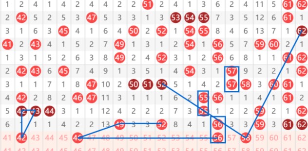 【第三区间41-60】:这个区间上期开出4个号码。本期推荐号码:42-46-56-58,42为1-2-1形态,46、56以区间同尾考虑,且46为同路号码延续,56为同路四期号码,58左右同路及5期斜连大明号码。三区间推荐重点号码:42-56-58。