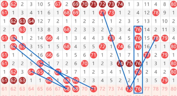 【第四区间61-80】:这个区间上期开出7个号码。本期推荐号码:68-69-71-75-76,68为同路号、偶数连号、同路对子号,并以三斜连的69组成对子,71则是奇数四斜连和同路号码;75左右斜连为重点号码,76具备从下到上1-2-3形态,并和75组成对子回补,作防守号码。四区间推荐重点号码:68-71-75。