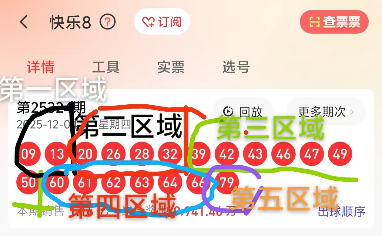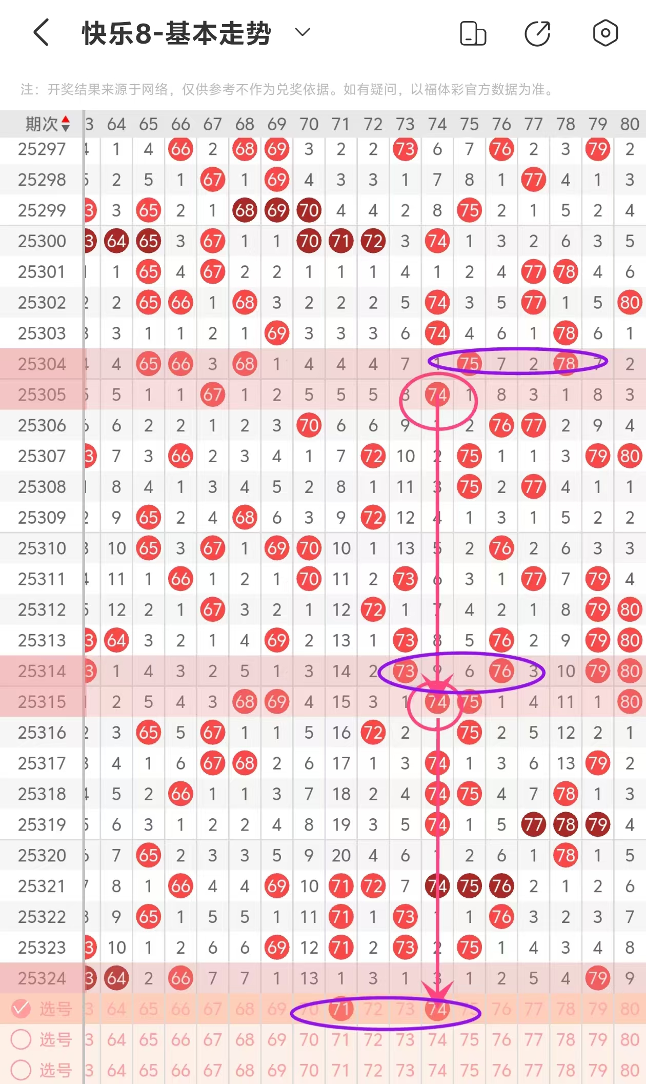 我们看上图是第五区域往上看20期可以看到74是每隔10期会开出来,按规律看这期会开74,因此选择74,上图我用紫色圆圈圈出75和78一起开,73和76一起开,在这期选择74的情况下,那么按规律就是选择71和74一起开,所以第五区域的选号就是71,74