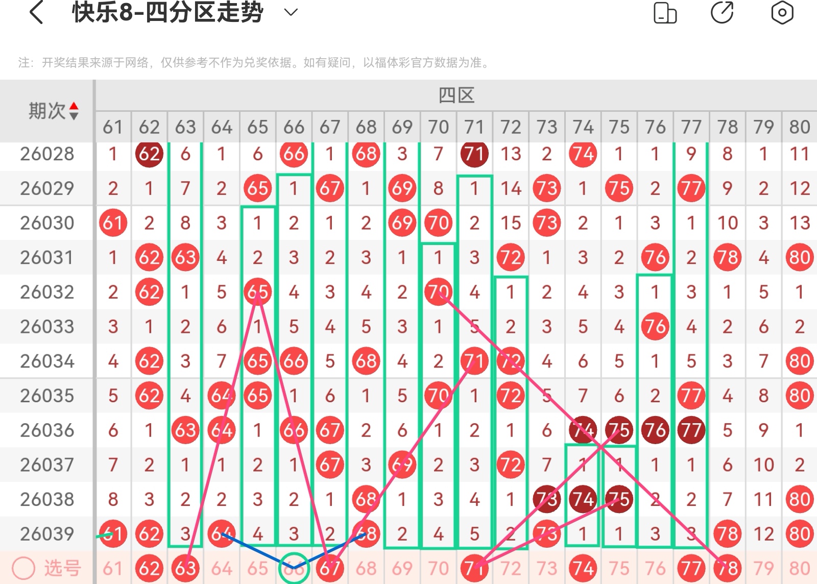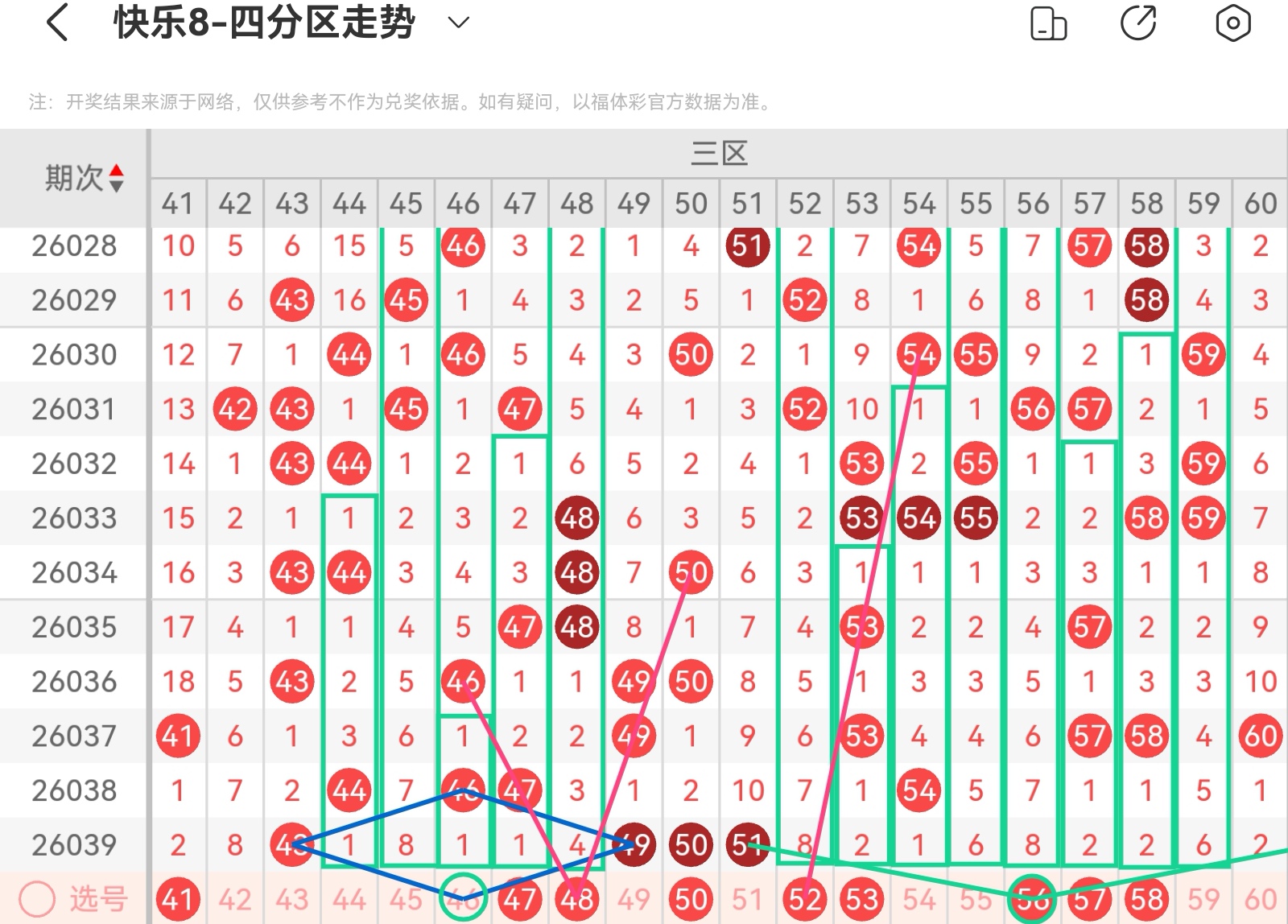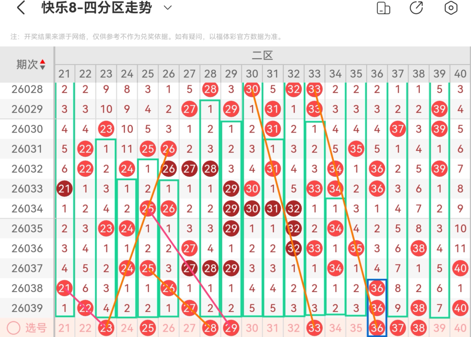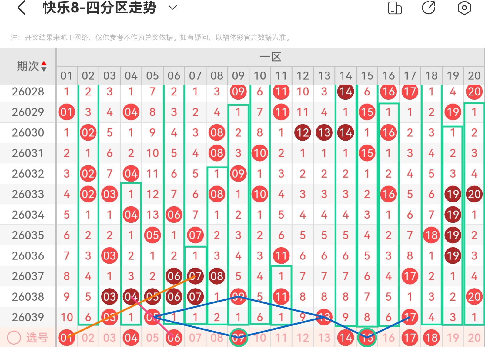 大家好,我是甜丝丝的坏事,主要以快乐八的形态走势、空位走势、遗漏走势以及斜连走势相结合的方法,用公认的四分区走势来进行预测分析,希望能让你有所收获。