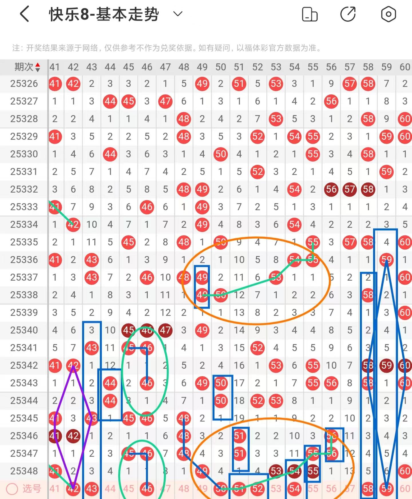 三区间上期稳定落号,一共开出六个号码球,本期考虑等同数量的号码球,注意近期38、39、40、41、42号码球的走势相似,本期注意42号码球,同时42号码球也是斜连走势构成平行四边形形态号码球,也是百期相似形态号码球,注意百期相似形态44号码球的回补,注意45、46号码球同期下落,隔期回补46号码球,注意直连转斜连走势回补的50号码球,阶梯落位重码走势注意51、52、54号码球,防守期数和值加减法的58号码球,注意隔期递增的59号码球,同时也是百期相似形态号码球,因此三区间关注42-44-50-54-59,注意本区间的选二复式42-44-50。