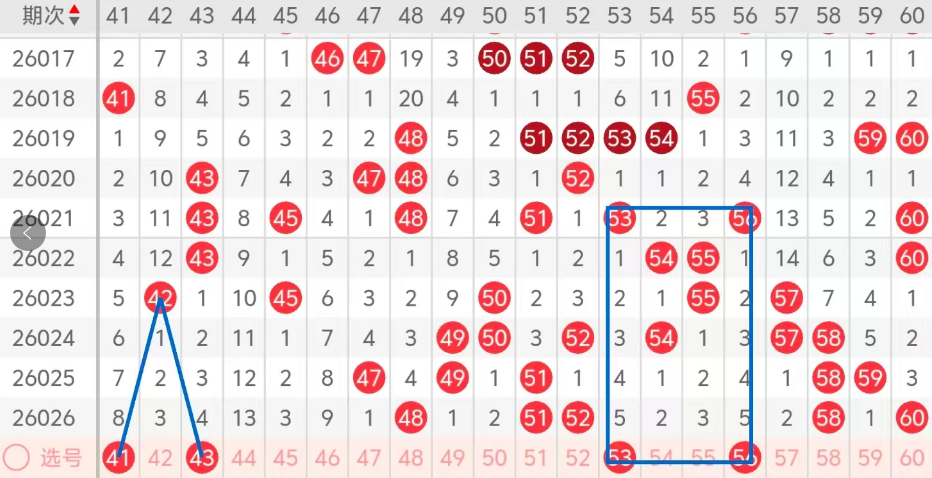 第三区间的走势分析:第三区间上期开出了五个号码球,主要的落号点位在三区间的后半区,走出了一奇四偶的形态走势,上期三区间的前半区落下了一个号码球,后半区落下了四个号码球,整个三区间处于走热的趋势,根据三区间的走势规律,今天的三区间我们主看前半区分边码的落位,主看41 43的回补,也是热码的落位,再看后半区53 56组合的回补,这四个号球建议大家打个四胆拖,或者打个四码三,或者两两组合比较稳妥,参考为主!