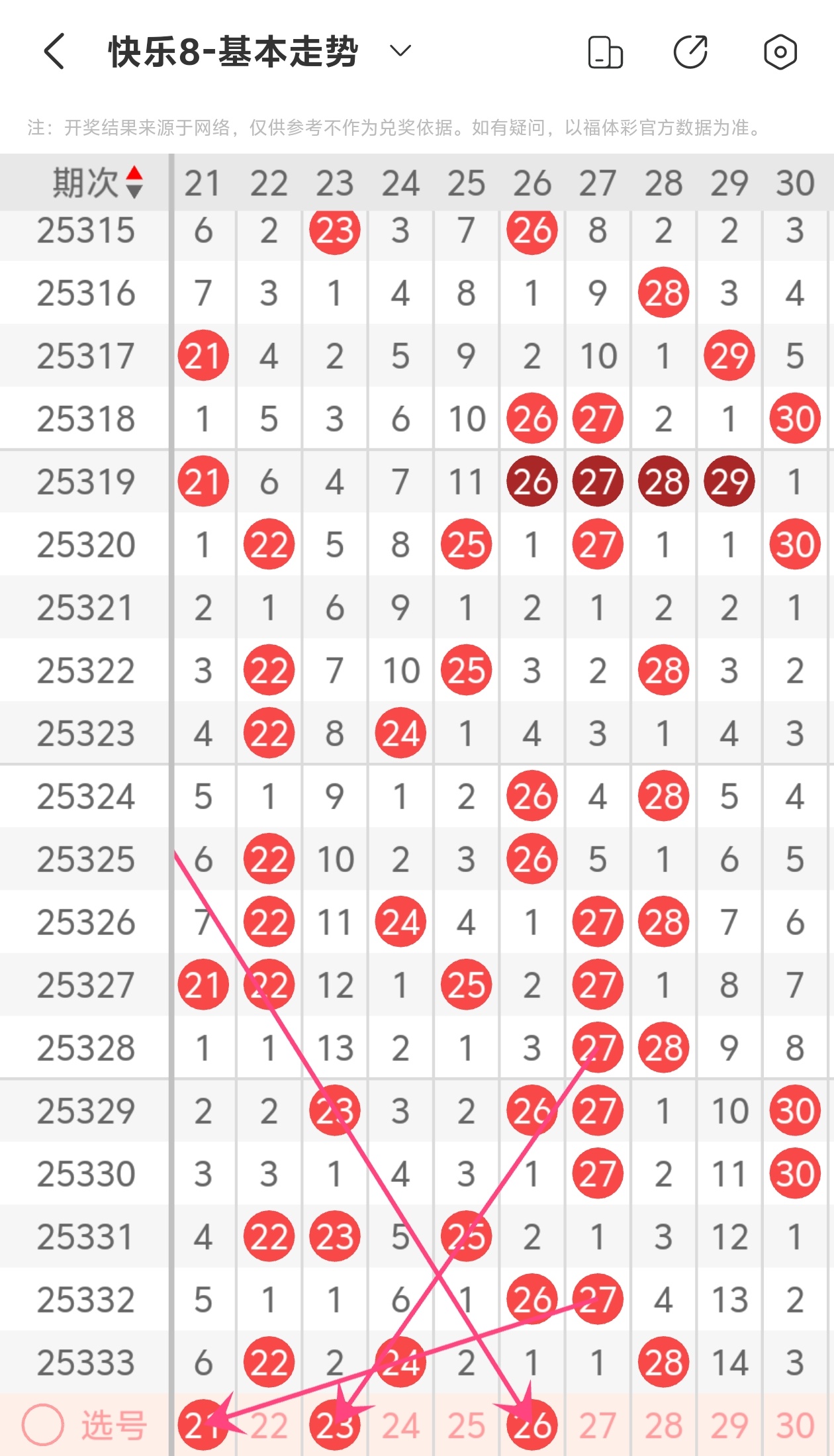 上期第三区间开出22 24 28,22为斜连走势,23为斜连走势,26为斜连走势,防22重,本期推荐21 26