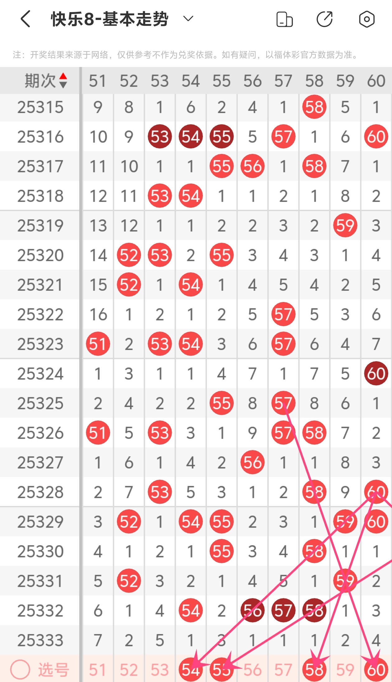 上期第六区间走空,54为斜连走势,55为斜连走势,58为斜连走势,60为斜连走势,本期推荐54 55 58 60