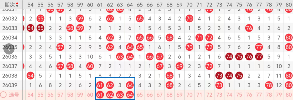 第四区间的走势分析:第四区间上期开出了七个号码球,主要的落号点位在四区间的前后半区,走出了两奇五偶的形态走势,上期四区间的前半区落下了四个号码球,后半区落下了三个号码球,整个四区间处于走热的趋势,根据四区间的走势规律,今天的四区间我们主看前半区龙头位置61 62 63 64这四个号码球的落位,今天有很大机会落下,注意61 63 64的组合,这四个号球建议大家打个四胆拖,或者打个四码复三比较稳妥,参考为主!
