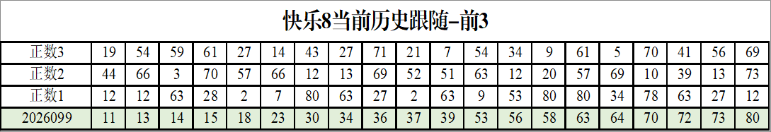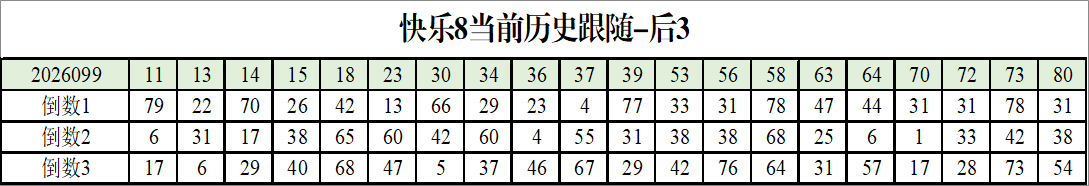 我感觉选热的同时,还要注意防冷条件开出,可以直接选取每个号码跟随出次前三的号码,也可以考虑把出次最后的三个数字加进去,不过这样可能号码太多,可以尝试。图上也能看出单独号码跟随的情况,我就不一一统计每个号码的出次了,我这里考虑提高概率,取每个号码历史跟随的前三号码和后三号码,根据2026099期的号码,我关注正数3和倒数3的号码号码为:
