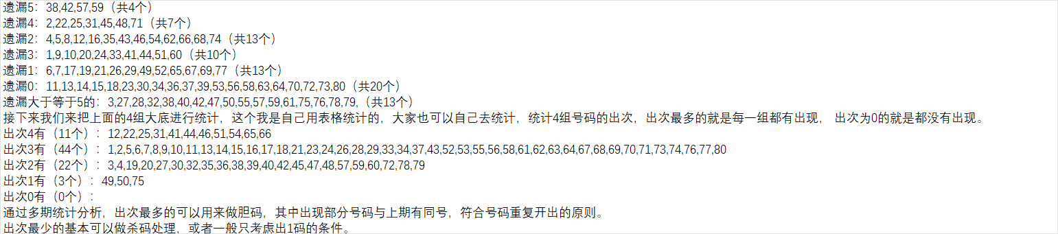 从上图看出,还是值得我们参考,经过统计精选了这些号码作为精选大底(4,5,8,12,13,14,15,17,18,23,26,29,30,34,35,36,37,53,56,58,69,70,72,73,80,),共25个,上期这个条件有27个,开出9个,所以可以用来作为我们进一步组号的一个条件。
