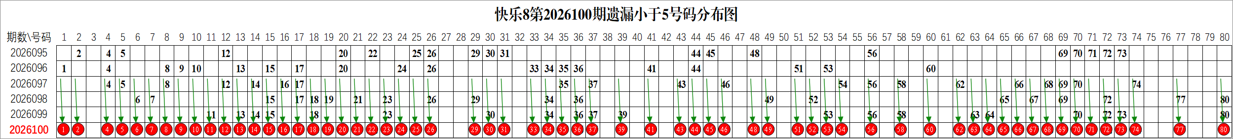 所以这个条件值得关注,从号码分布图上我们可以分析出,遗漏小于5期的号码有: