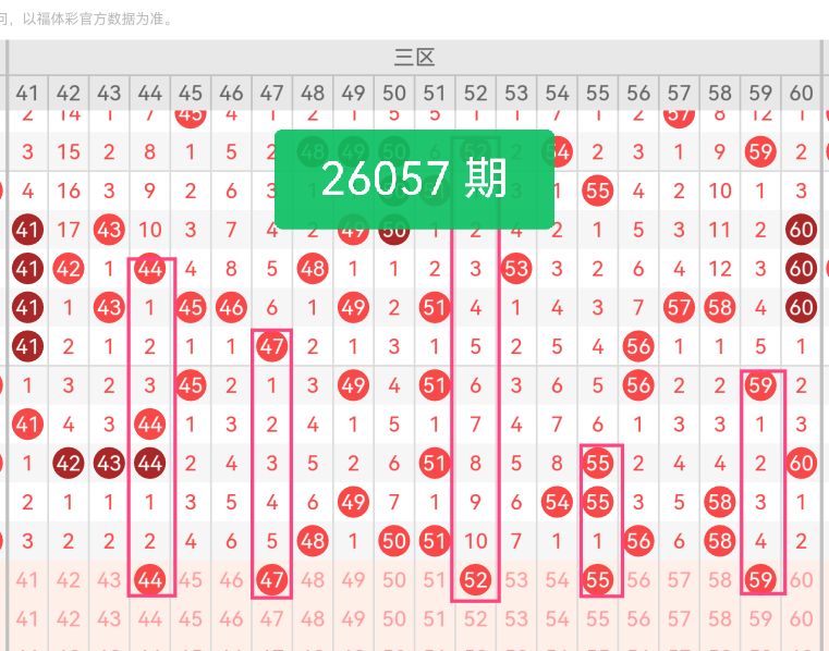 上期第三区间开奖5个号码,本期可能会稳定开出。44 占据三区前段位置,拉开区间起点,保证前三分之一段有号码支撑。 47 紧随44之后,丰富前段号码层次,让三区开头不单薄,分布更饱满。 52 处于三区正中间,承上启下,连接前后两段,是整个三区的关键支点。 55 位于三区中后段,平衡后半段密度,与前后号码间距适中,走势更流畅。 59 靠近三区末端,为衔接四区做铺垫,让整个中段到后段过渡更顺滑。
